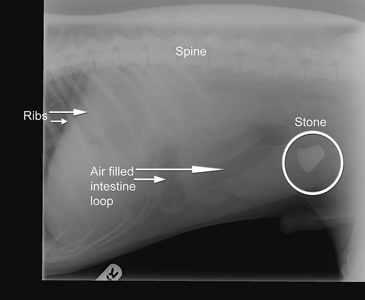 The white item you can see in his abdomen is a stone! Arky had willingly eaten this stone! It had made its way through his stomach, through the top of his intestines before getting stuck halfway through his guts. At this point things became very serious. If this stone was left where it was Arky would become even more ill. So we took him straight to theatre where we removed the stone surgically.
