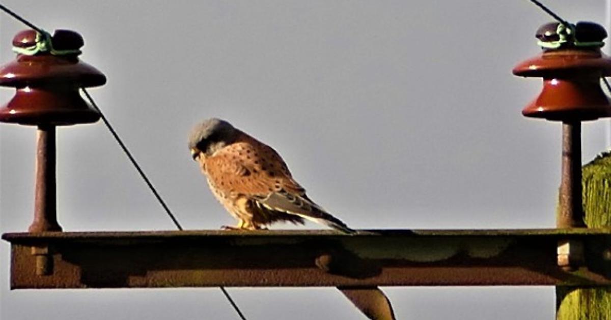 A buzzard and a pair of red kites ride the wind. We spot a male kestrel on a telegraph pole. It promptly flies down into the field to pick up something (perhaps a worm or beetle) and returns to the pole.