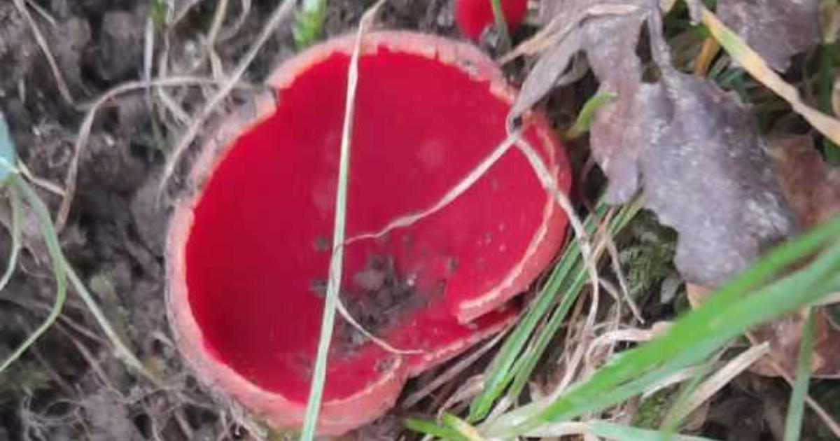 We continue up a slope and enter Holme Copse, just short of a right of way and there they are, some scarlet elf-caps, or cups, growing on rotting branches on the woodland floor like something out of a fairytale.