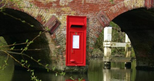 The red letterbox was installed on a buttress on the downstream side of Sonning Bridge, which crosses the River Thames.