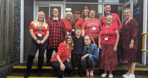 Support staff dressed in red clothes and accessories to show their support for Duchenne ahead of the world awareness day on Saturday. He was diagnosed with the condition in 2017.