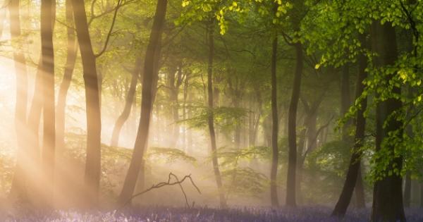 The image took multiple attempts to capture and shows a field of bluebells taken during a misty morning sunrise with sunbeams gleaming through the forest tops and down on to the flowers.