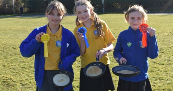 About 40 pupils from the village primary school gathered in the green with pancakes and frying pans in tow.