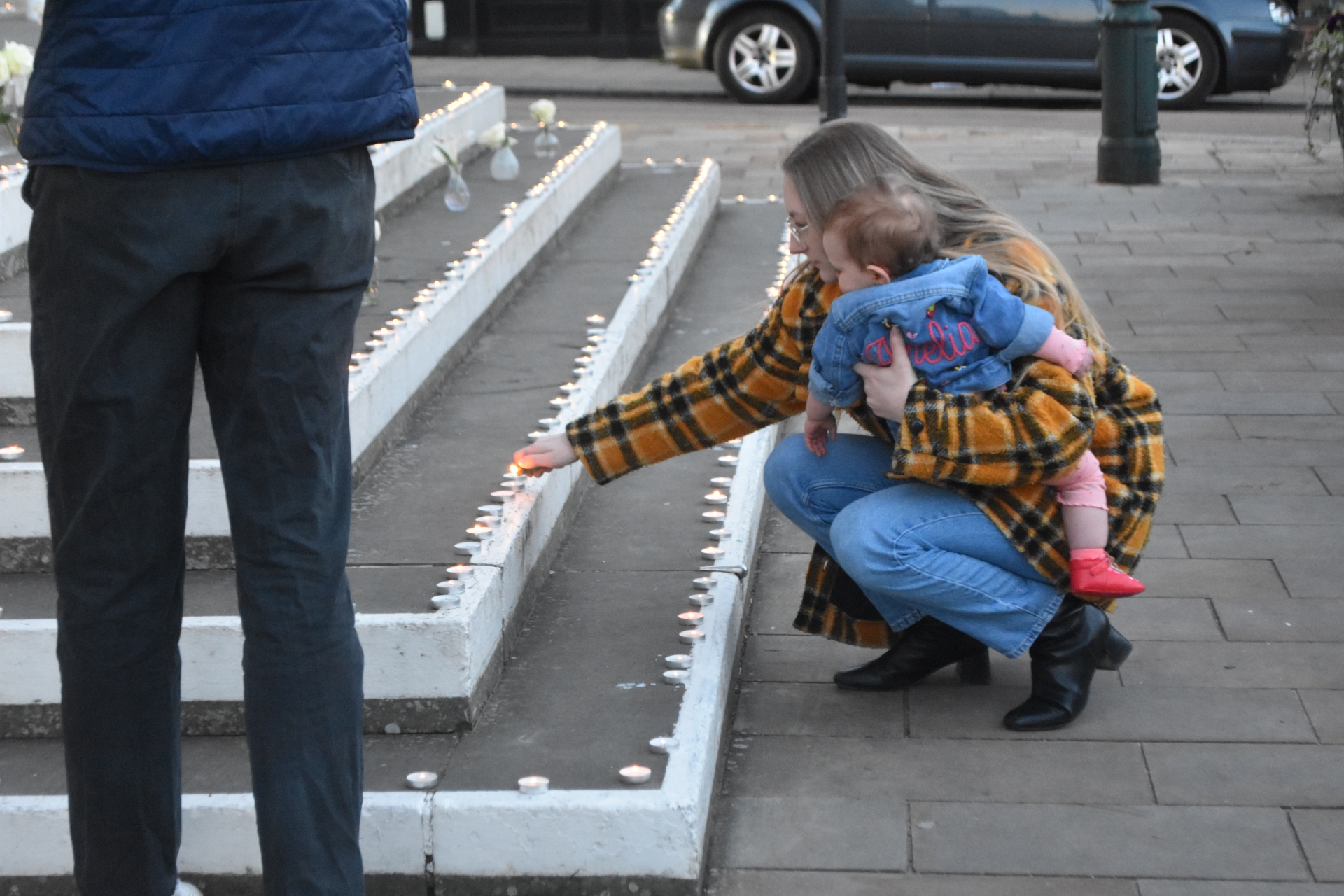 Mourners light candles on the steps of the town hall