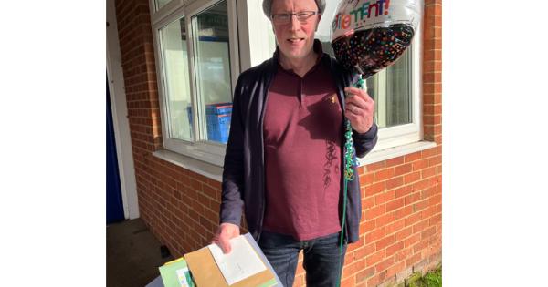 Darryl Trimmings with gifts and cards from staff and students