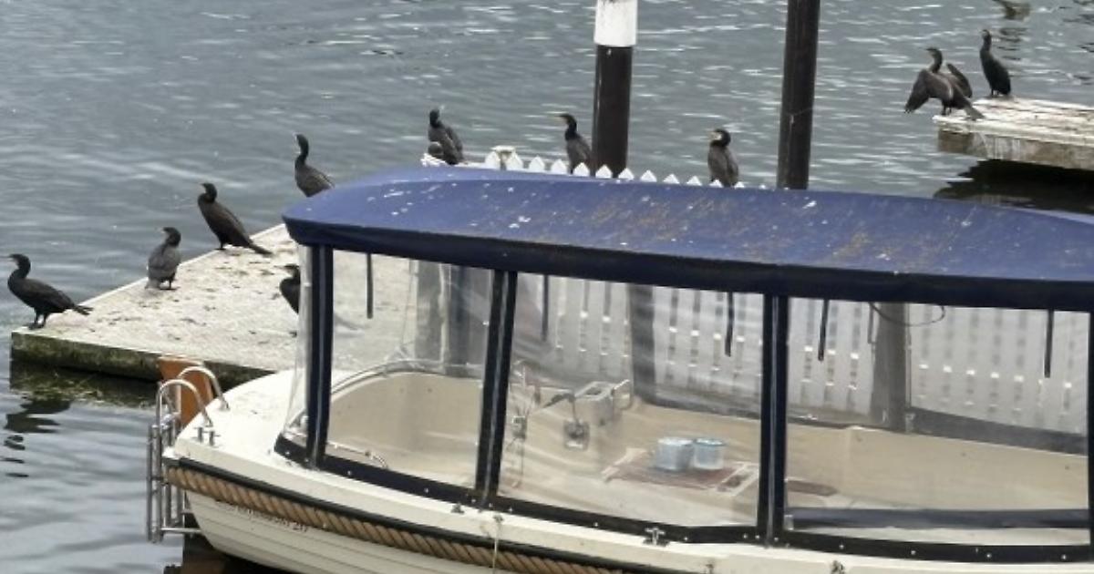 I have included a cropped version which focuses more on the cormorants rather than my neighbour’s boat! — Yours faithfully,
