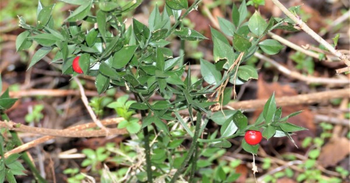Leaving the Tesco car park at the end of Napier Road in Reading, Rosemary and I walk to the adjacent River Thames. On our way through a gloomy patch of trees, we find some butcher’s-broom bearing striking red berries.