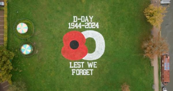 The poppy is about 20m wide by 30m tall and is best seen from the air. It has been positioned to represent an eight next to a zero, with the dates of the D-Day anniversary above it.