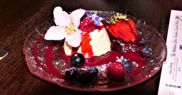She has a choice of six options minus the cheeseboard. She goes for a summer berry panna cotta.