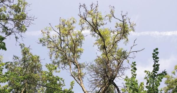 An infected tree will display a distinct symptom when the leaves in the crown curl up and die.