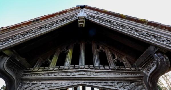 The church’s fine lych gate under which the actors walked has inscriptions to mark the death in July 1884 of 14-year-old Violet Constance Noble, of Park Place, from scarlet fever.